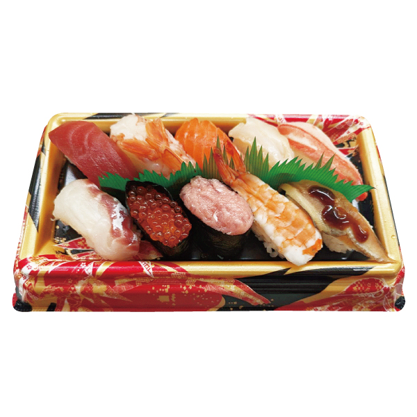 デリカ1パック特定原材料:えび・かにまぐろ・赤えび・トラウトサーモン・つぶ貝・かに・たい・いくら・ねぎとろ・寿司えび・穴子