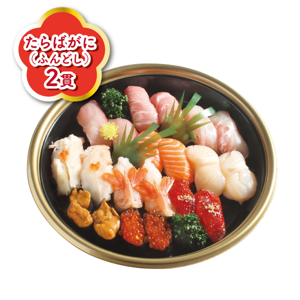 水産2人前・1パック特定原材料:一部にえび・かに・いくら・さけを含む・本まぐろ・寒ぶり・たらばがに(ふんどし)・ほたて・赤えび・サーモン・真鯛・筋子・うに・いくら