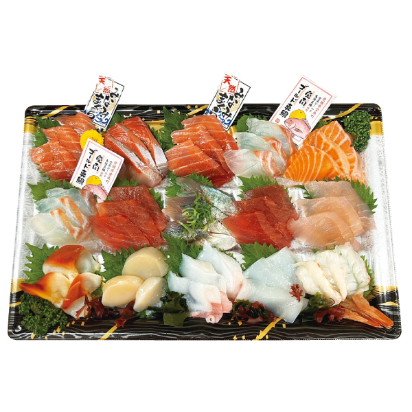 天然みなみまぐろ・ぶり・愛南ゴールド真鯛・生サーモン・生まぐろ・あじ・びんちょうまぐろ・ボイルほっき・ほたて・たこ・いか・赤えび