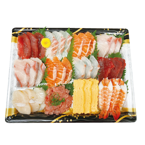 生まぐろ・真鯛・生サーモン・ぶり・ほたて・まぐろすきみ・玉子焼き・ブラックタイガー寿司えび